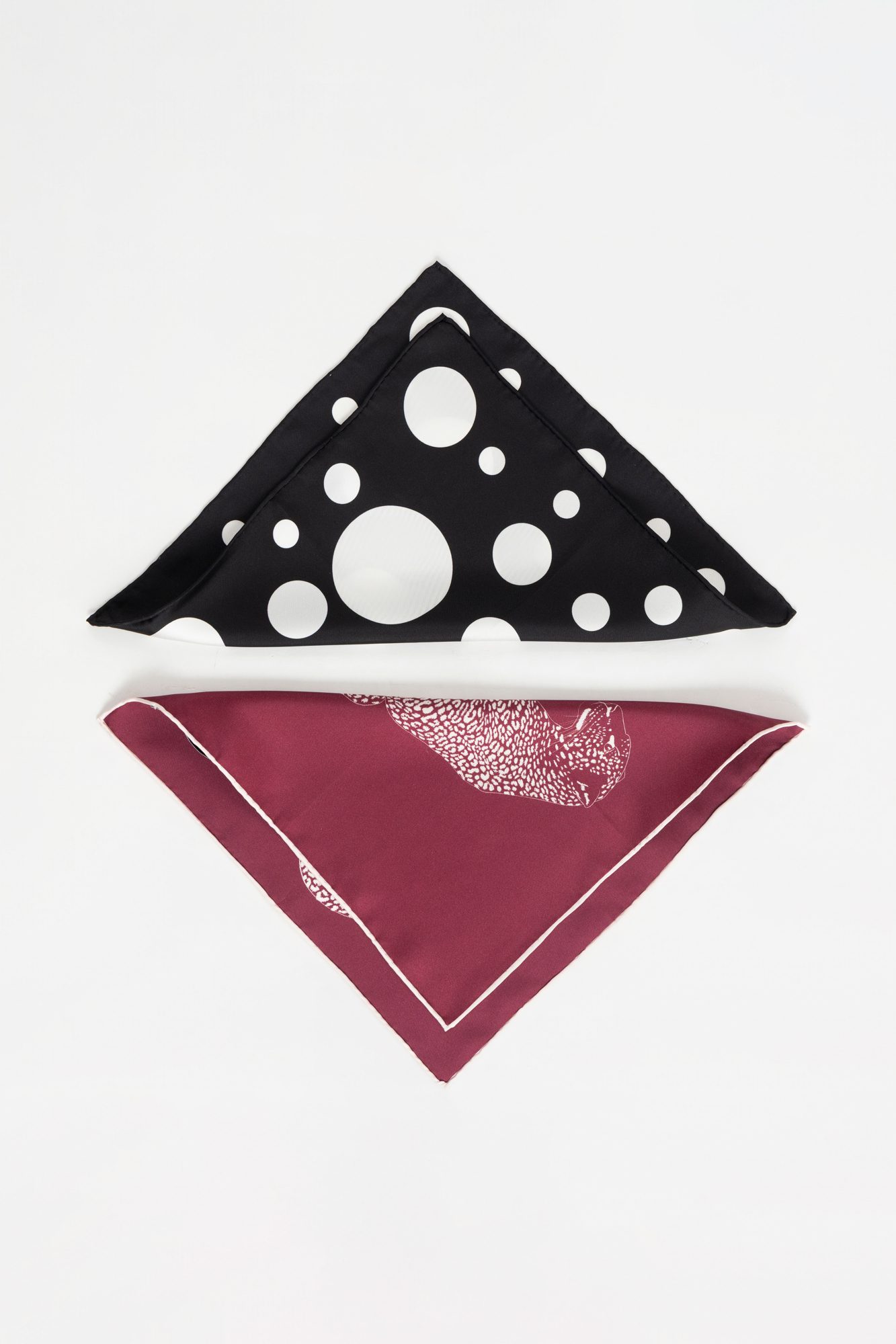 Грижа: За да запазите красотата на своята копринена кърпичка, избягвайте контакт с дъжд, вода и всякакви химикали (включително парфюми и кремове). Съхранявайте я разгъната и без да е завързана. При нужда я почиствайте само в професионално химическо чистене.